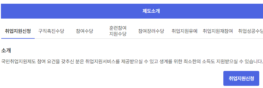 | 요건심사형: 15~69세 구직자 중 가구단위 중위소득 60% 이하이고 재산 4억원(15~34세 청년(병역의무 이행기간 가산_최대 37세)은 5억원) 이하이면서, 최근 2년 안에 100일 또는 800시간 이상의 취업경험이 있는 사람 선발형: 요건심사형 중 취업경험요건을 충족하지 못한 사람(단, 15~34세의 청년(병역의무 이행기간 가산_최대 37세)은 가구단위 중위소득 120% 이하이고 재산 5억원 이하이면서, 취업경험 무관) 구직촉진수당(월50만원×6개월+부양가족* 1인당 10만원씩 월 최대 40만원 추가지원) 및 취업지원서비스 제공 *구직촉진수당 지급주기 중 미성년자(만 18세이하), 고령자(만 70세이상), 중증장애인(장애인복지법 상 증명서 발급자) 해당자 |