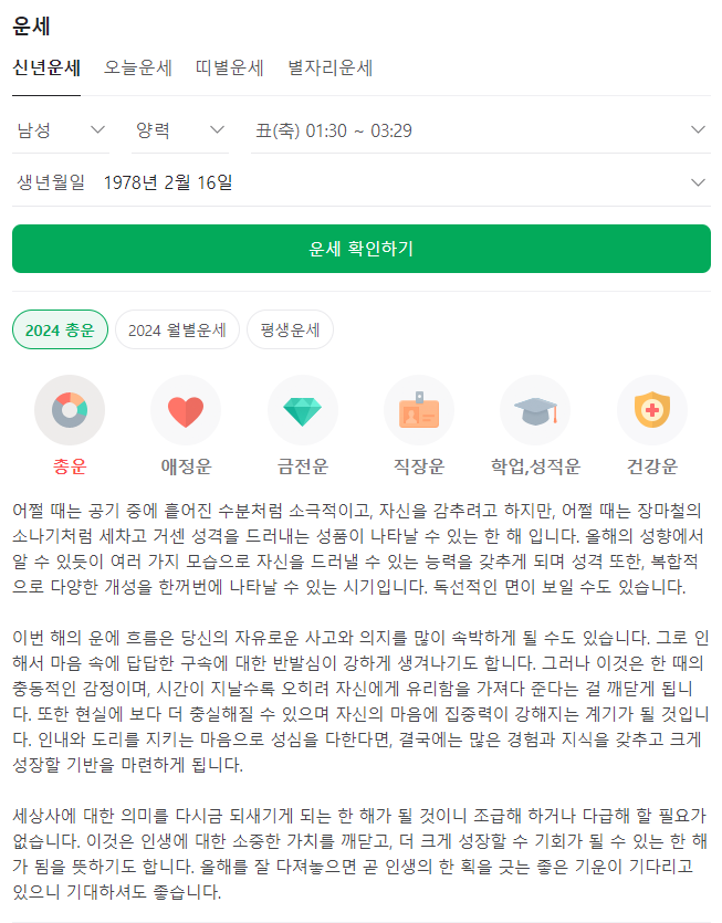 이렇게 총운, 애정운, 금전운, 직장운, 합업, 성적운, 건강운으로 나뉘어있고 2024년 월별 운세와 평생 운세도 같이 볼 수 있습니다.