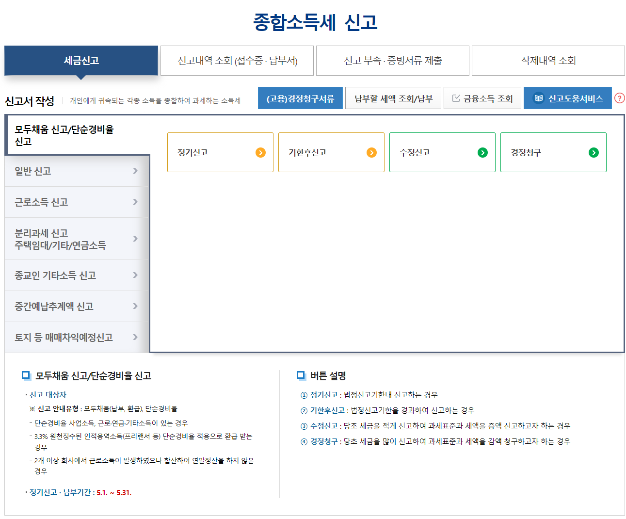 정기신고 기간: 5월 1일부터 5월 31일까지(단, 성실신고확인서 제출자는 6월 30일까지)